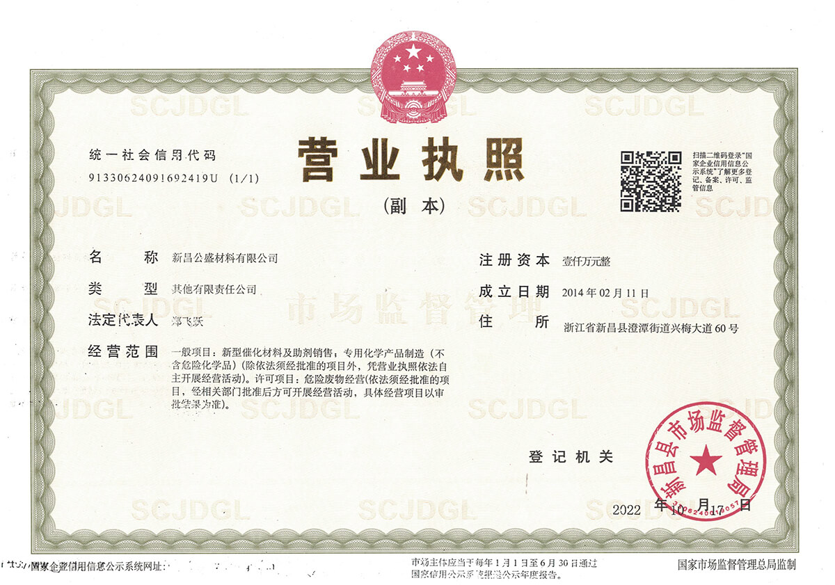 新昌公盛材料有限公司成立于2014年,坐落在江南大佛名城浙江新昌,地理位置優(yōu)越,交通便利,并配備有現(xiàn)代化的廠房和實驗樓,總占地面積80畝。公司聚焦于研發(fā)和生產(chǎn)用于醫(yī)藥、農(nóng)藥、染料、材料等精細化工領域的貴金屬催化劑。目前主要從事鈀炭、鉑炭、釕炭等多項催化劑及醋酸鈀、DPPF二氯化鈀、雙三苯基膦二氯化鈀、四三苯基膦鈀、DBA鈀等均相催化劑的研發(fā)、生產(chǎn)、銷售以及失效鈀、失效鉑催化劑的回收再加工等業(yè)務。公司成立以來,一直以提升客戶產(chǎn)品的競爭力為經(jīng)營宗旨,通過持續(xù)改進客戶所用催化劑的性能,來提高客戶產(chǎn)品的收率,提高催化劑的套用次數(shù),提高失效催化劑的貴金屬回收率,來降低客戶產(chǎn)品中貴金屬催化劑的成本,進而提升客戶產(chǎn)品的競爭力。
